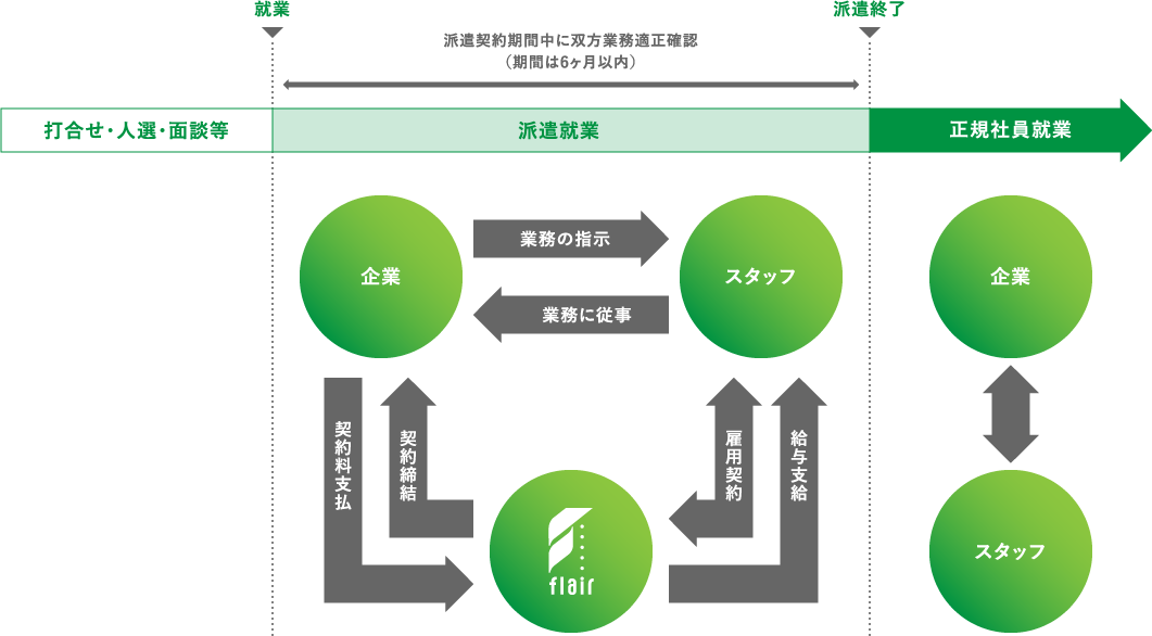 最長6ヶ月派遣し、派遣期間終了後に企業と求職者の双方が 合意のもと、直接雇用となります。